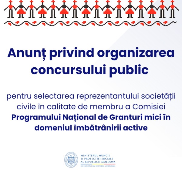 Ministerul Muncii și Protecției Sociale invită reprezentanții societății civile, să participe la concursul de selectare a membrilor Comisiei Programului Național de Granturi mici în domeniul îmbătrânirii active.